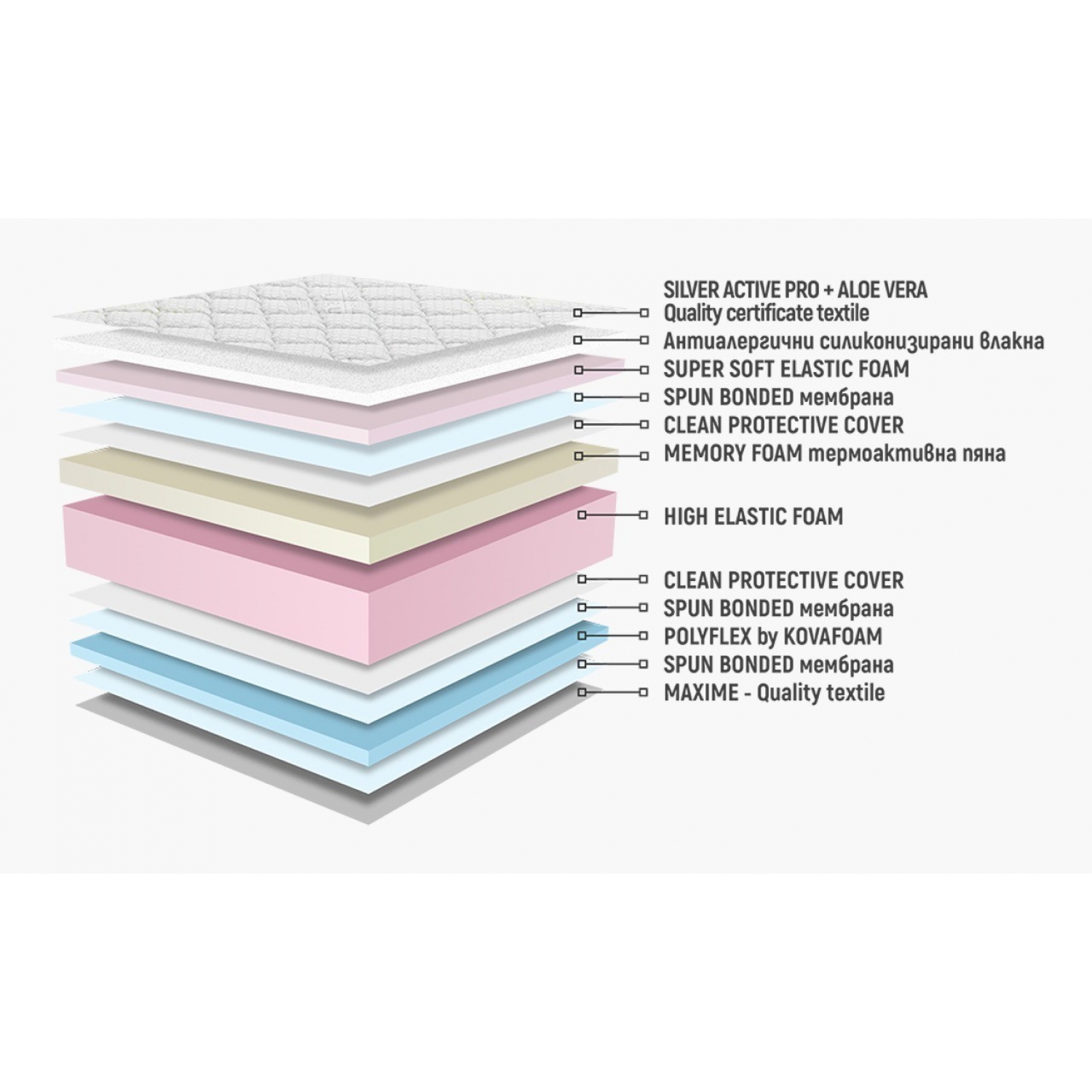 HIGH ELASTIC FOAM с висока плътност в сърцевината подсигурява перфектна точково – еластична опора на тялото. За оптимално напасване и равномерно разпределение на тежестта към матрака се грижи обемният слой от термоактивна MEMORY FOAM. Красив капитониран калъф завършва модела. Делимия цип улеснява поддържането на перфектна чистота. Сребърните нишки, втъкани в текстила SILVER ACTIVE PRO, отделят сребърни йони, а капсулите ALOE VERA придават SPA ефект. Модел със златен медал за комфорт + НАНИ иновации от 21 век.