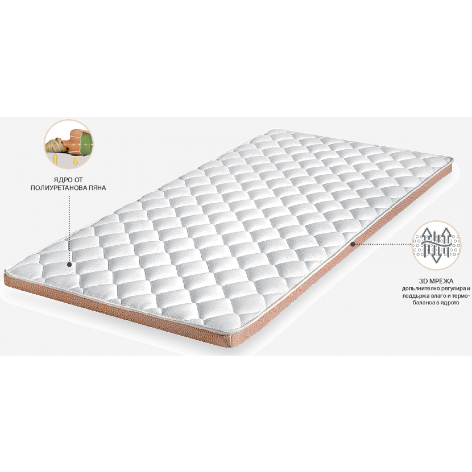Топ матрак с ядро от комфортна пяна. Дишаща мрежа по повърхността проветрява структурата и не допуска развитието на микроорганизми, а прошивката съдържаща обемни мемори частици прави топера обемен, мек и удобен.